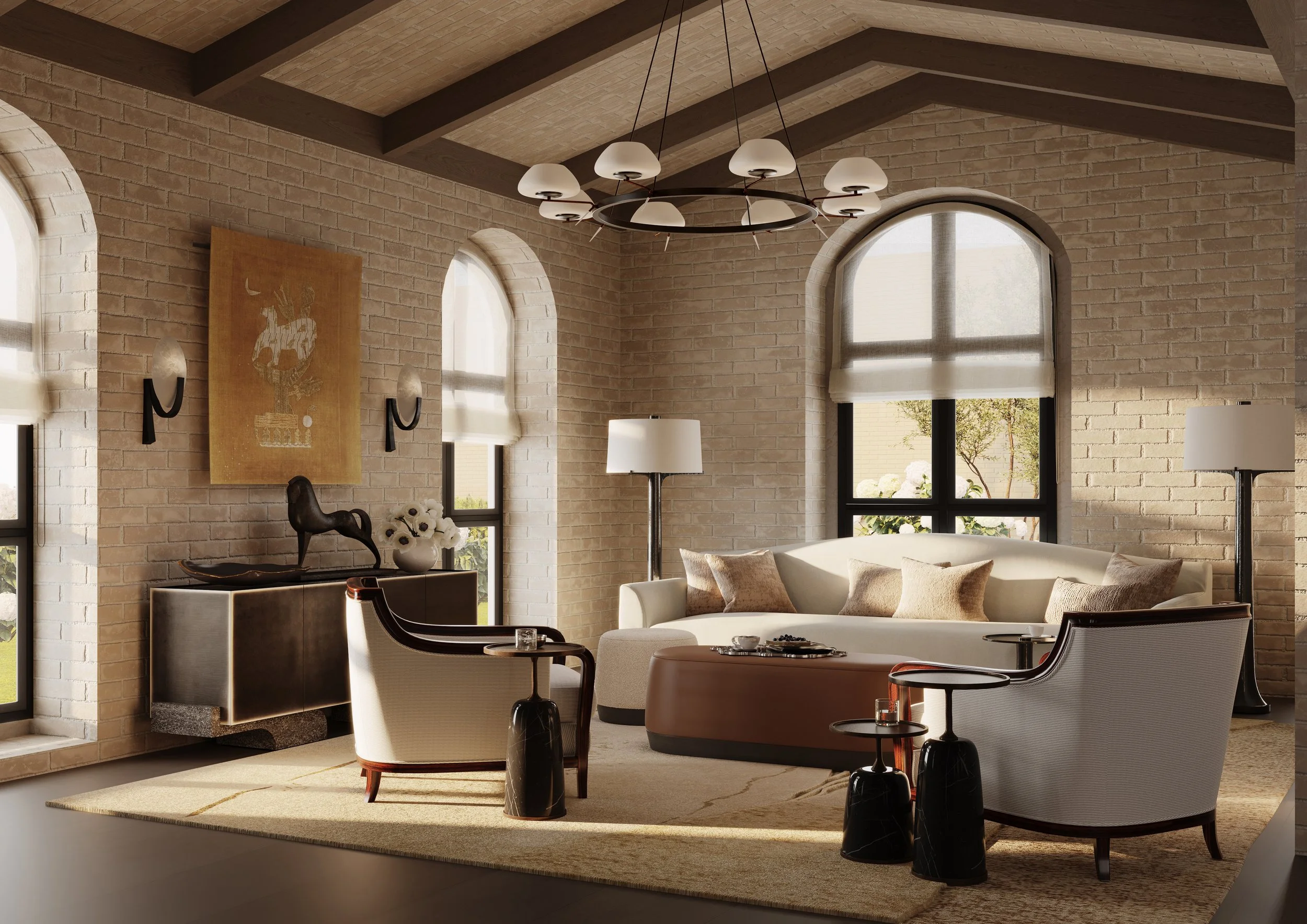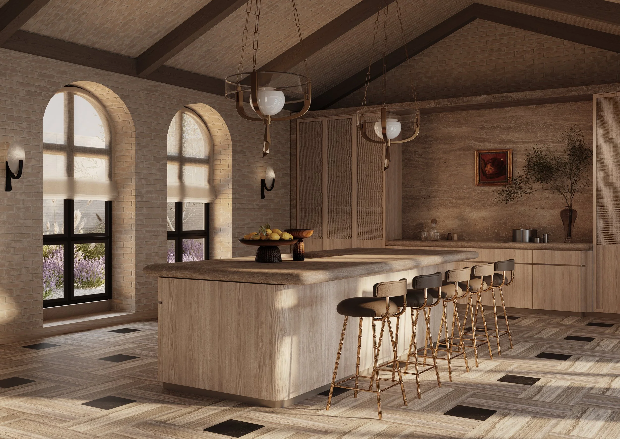 A full concept for an open-plan living room and kitchen within a private villa in California. The brief was to create a warm, elegant entertaining space that balanced architectural character with contemporary furnishings, refined materials, and a calm, cohesive palette.